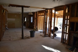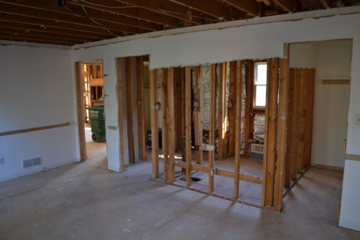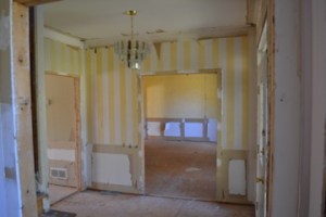 This week has been a week of discovery. First, once the foyer sheet rock was taken down and the front room walls were removed, termites had made their mark all over. There is no active infestation but they had more than a picnic at some point! The front door header, dining room header and many of the 2×4’s served as breakfast, lunch and dinner at some point.