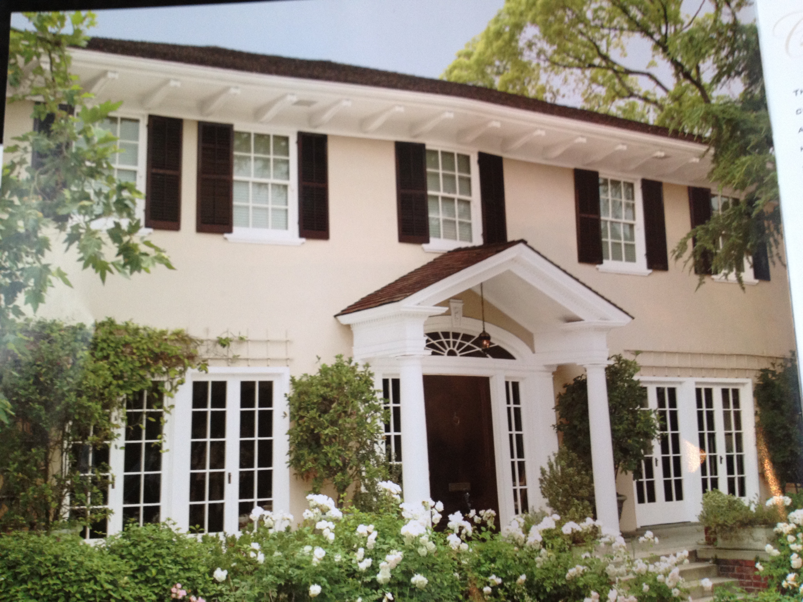 Pretty, I think…kind of a beige with a dark brown shutter and crisp trim. Love the green landscape with it. This looks like our house but I wonder if it is too yellow…hmmmm. I have the magazine advertisement from Behr with this picture and it looks better in person that online.